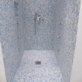 Boden: 30/60cm Feinsteinzeug sandfarben, Oberfläche strukturiert (rutschhemmend) Mosaik: Glasmosaik Mix blue