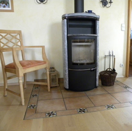 Beschreibung: Der feuerfeste, an den Dielenboden angearbeitete Fliesenbereich setzt den Kaminofen besonders gut in Szene.