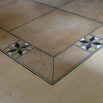 Boden: 30/30cm cottofarbene Fliesen glasiert Fries: aus Bodenplatten zugeschnitten mit Dekorelementen